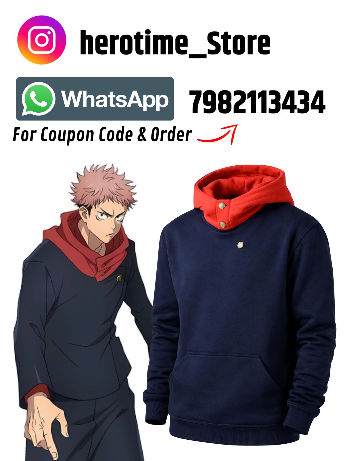Herotime Store Launch Premium 100% cotton Jujutsu Kaisen Yuji Itadori hoodie with a comfy regular fit. Anime-inspired winter wear perfect for fans and everyday style.